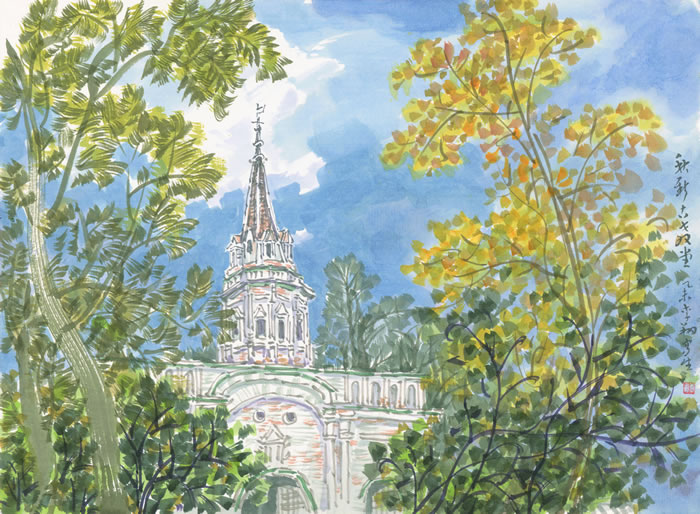 李翔《 新秋教堂古》宣纸设色 24cmX33cm 2015年