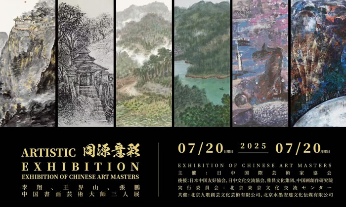 2025年7月20日下午,“同源意彩——李翔、王界山、张鹏中国画家三人作品联展”在日本东京浅草公会堂美术馆启幕。本次展览由日中国际艺术家协会主办,日本中国友好协会、日中文化交流协会、雅昌文化集团、中国画创作研究院提供支持,北京东京文化交流中心承办,展览旨在以书画为桥,搭建起中日文化交流的新平台。