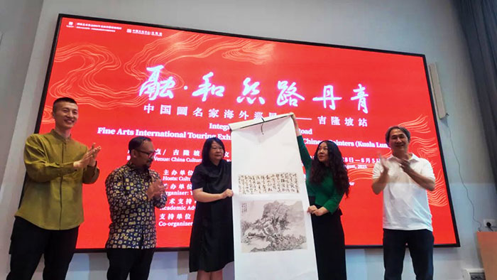 7月30日至8月6日,由文化艺术出版社有限公司与吉隆坡中国文化中心联合主办的“融·和:丝路丹青中国画名家海外巡展”在吉隆坡中国文化中心开幕。此次展览系国家艺术基金2024年度传播交流推广资助项目,马来西亚国家美术馆馆长与艺术发展司司长巴克蒂亚·纳因, 中国艺术研究院文化艺术出版社有限公司负责人、《传记文学》杂志主编斯日古楞,中国艺术研究院国画院副院长曾三凯,中国驻马来西亚大使馆代表陈闯,吉隆坡中国文化中心主任韩宁,中国艺术研究院一级美术师丁鼎,山东画院副院长孙棋,中国艺术研究院写意画院一级美术师卫德章,中国艺术研究院写意画院一级美术师包洪波及马来西亚艺术家、文化界及媒体代表等80余人出席开幕式。