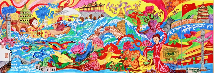 作品以京杭大运河为主线,生动呈现北起北京、南至杭州,全长1794公里的运河沿线风光。标志性建筑错落其间,特色民俗元素融入绚丽色彩,串联起运河文化脉络,展现运河承载的历史底蕴与多元风貌。
