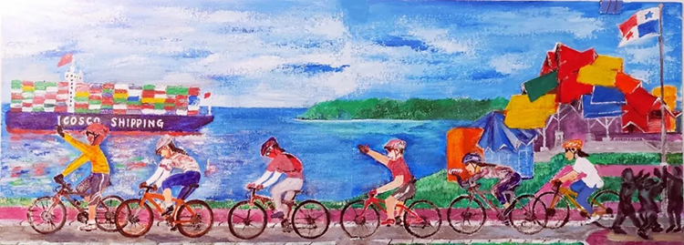 作品生动呈现了一群青年人骑行穿越巴拿马运河岸堤的场景。画面左前方,一艘满载集装箱的中国货轮正缓缓驶入巴拿马运河,彰显着中巴经贸交流的活力。右下角,人们举行升国旗仪式,传递着对历史的铭记与对和平的珍视。