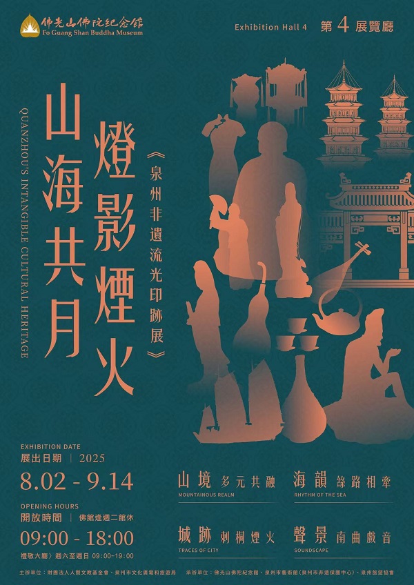 由泉州市文化广电和旅游局联合主办,佛光山佛陀纪念馆、泉州市艺术馆(泉州市非物质文化遗产保护中心)、泉州旅游协会、泰华宸美术馆共同承办的 “山海共月·灯影烟火——泉州非遗流光印迹展” 8月2日在佛光山佛陀纪念馆第四展厅开展。展览以泉州千年海丝文化为轴心,呈现22处世界遗产地标与30余项非遗技艺,为台湾民众开启一场穿越宋元东方大港的时空对话。