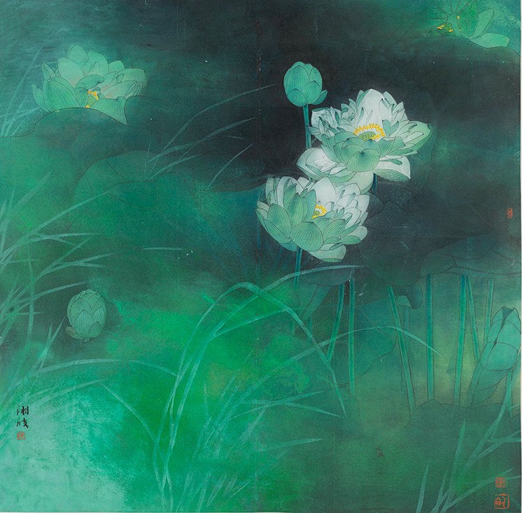 “观荷新境”,以20余件与荷花主题相关的题材作品,结合打破传统与科创的壁垒,将工笔荷花的古典雅致与数字艺术作品《观・荷》共同展出。作为当代深圳画派的探索和践行者,陈湘波始终结合城市的文化特色,努力探索 “水墨 + 科技”的可能性。他的新媒体装置《观・荷》以传统工笔荷花为原型,通过数字感应技术实现 “观者触之则花瓣开合”的交互体验,将传统 “一花一世界”的哲学观转化为沉浸式数字叙事,将古典的笔墨与动态光影融合交织,既延续了文人画中“荷”的高洁意象,又以科技赋能呈现全新视觉体验,诠释着南山“文化+科技”的独特基因。