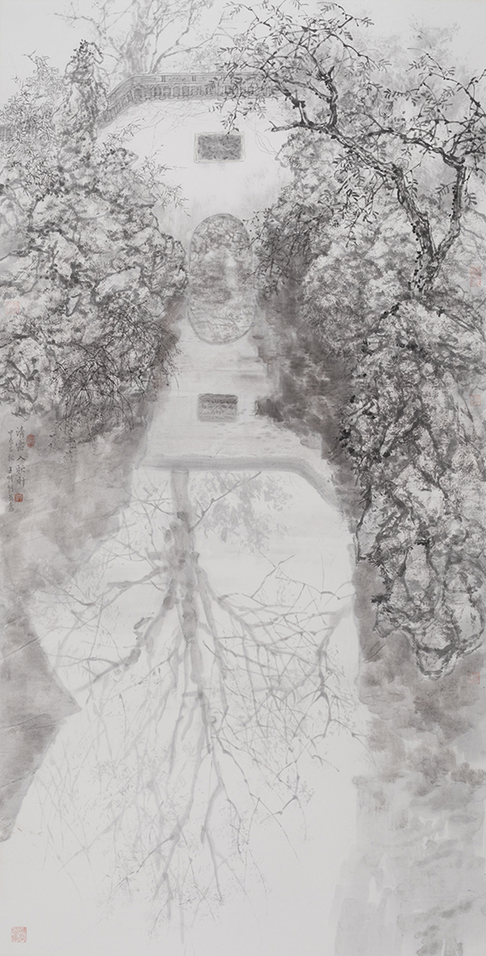 王明明自幼浸润传统文化,师承李苦禅、蒋兆和、周思聪等艺术大家。数十年来,他遍访南北名园,于颐和园的皇家气象中悟天地之大,在拙政园的文人意境中品岁月之幽。他深谙“外师造化,中得心源”之妙谛,以园林为媒介,将自然之景升华为心中之境,在虚实相间中追寻“唯道集虚”的东方美学至境。正如其所言:“园林是古人安放身心的归宿,亦是升华人生的载体。”这既是对自然万物的深情观照,更是对“天人合一”哲学境界的诗意抵达。