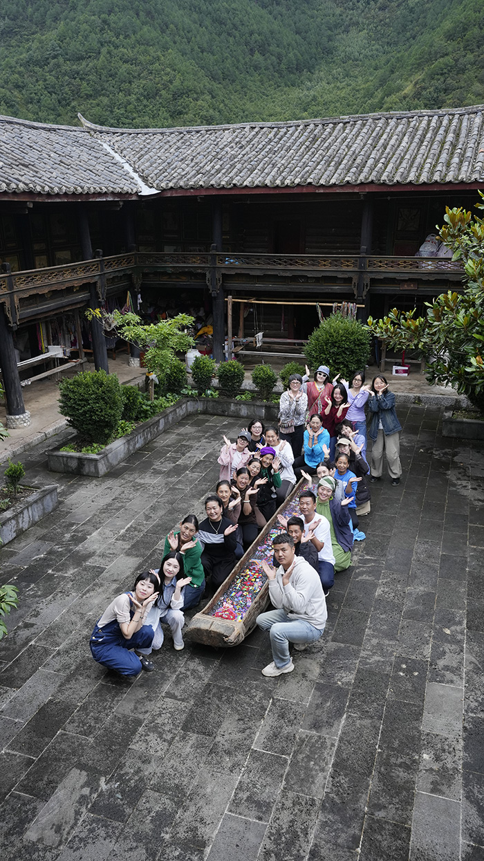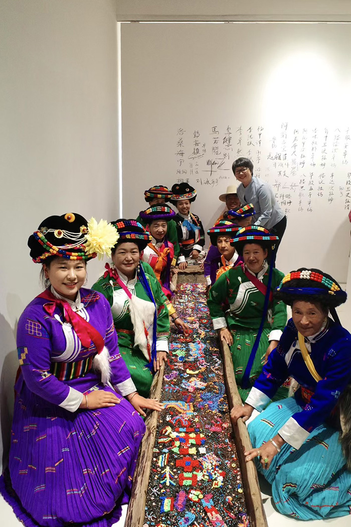 艺术家罗明君与作品《轻舟》的摩梭共创姐妹在展览现场