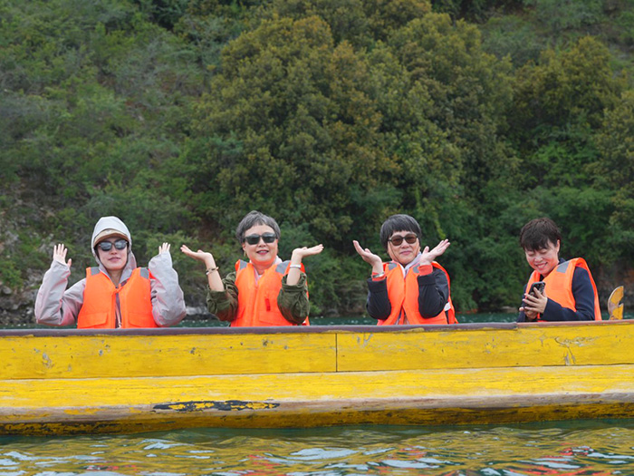 她美术馆学术论坛嘉宾与艺术家在泸沽湖上泛舟,并作出她美术馆“一起MOWA”的手势