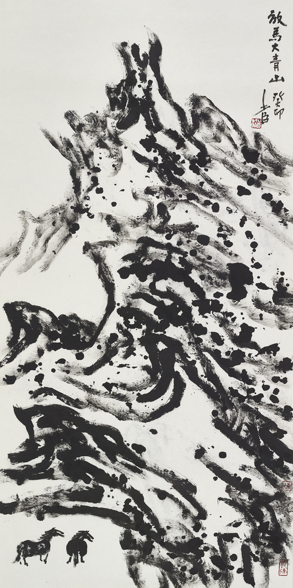 另外,邢少臣先生深谙“计白当黑”这一东方美学的精髓,并在创作中将其发挥得淋漓尽致。他精心经营画面布局,使得空白与墨块、线条相互生发,彼此映衬,共同构建出既空灵通透又浑厚饱满的独特审美空间。他对“虚”“实”关系的精妙掌控,使得画面在雄强厚重之余不失灵动,充满令人回味的哲思。