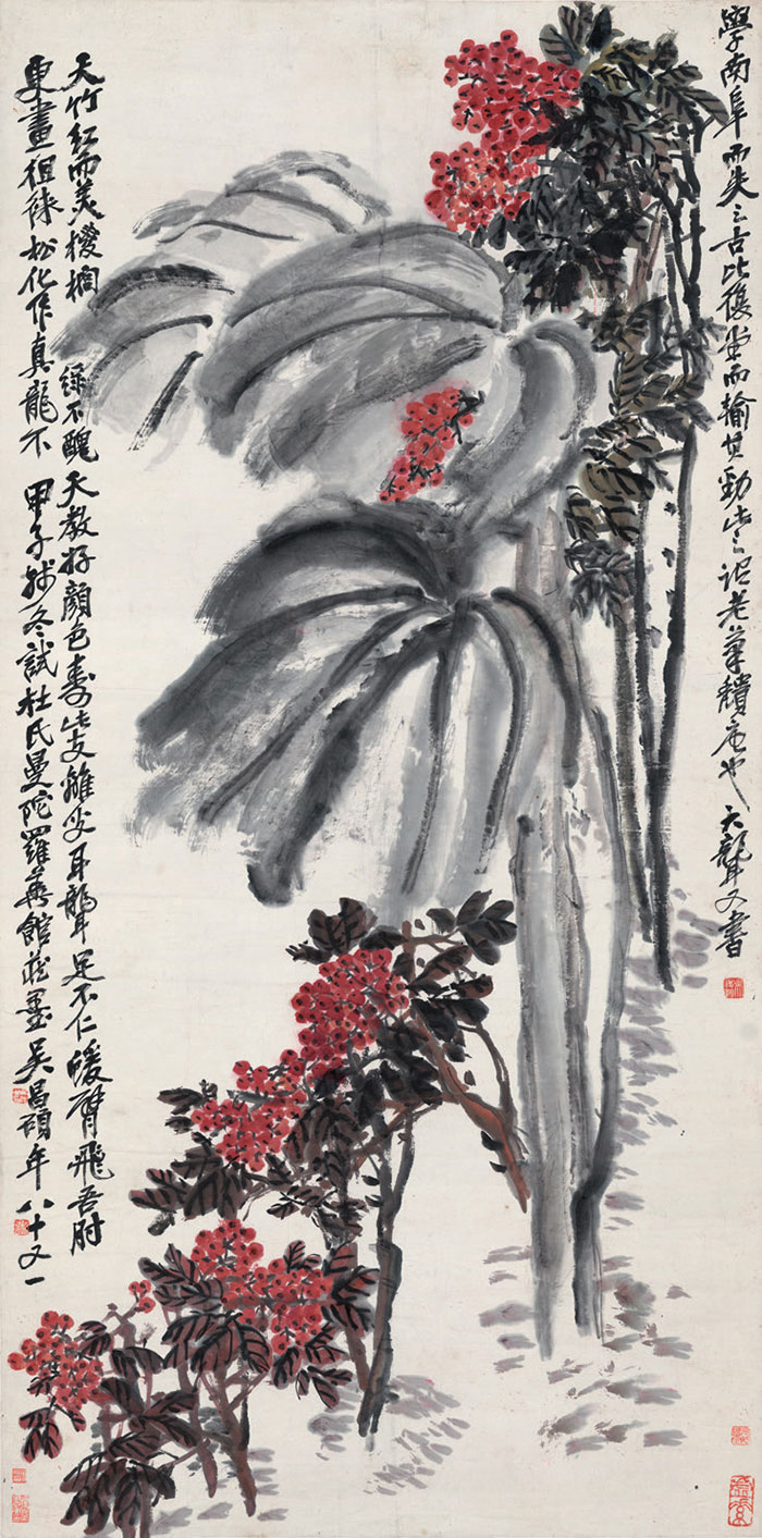 天竹棕榈 吴昌硕 1919年 138cm×68.5cm 纸本设色 西泠印社藏