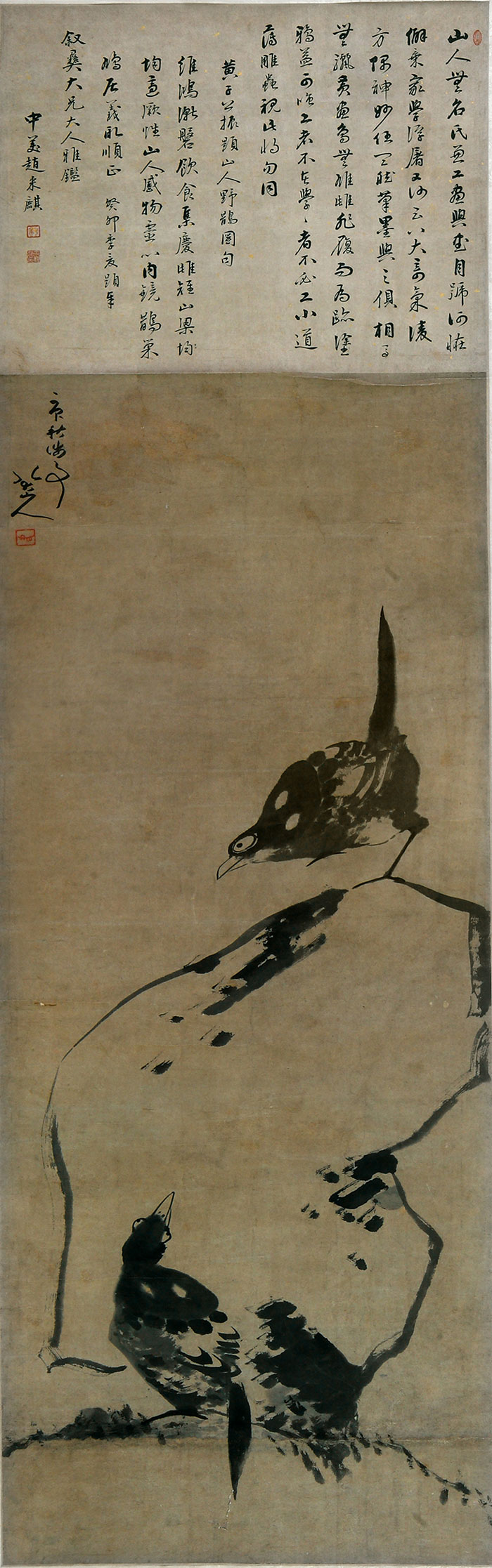 双鹊大石图 八大山人 1960年 121cm×49cm 纸本墨笔 八大山人纪念馆藏