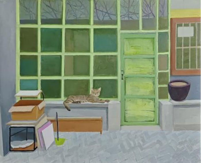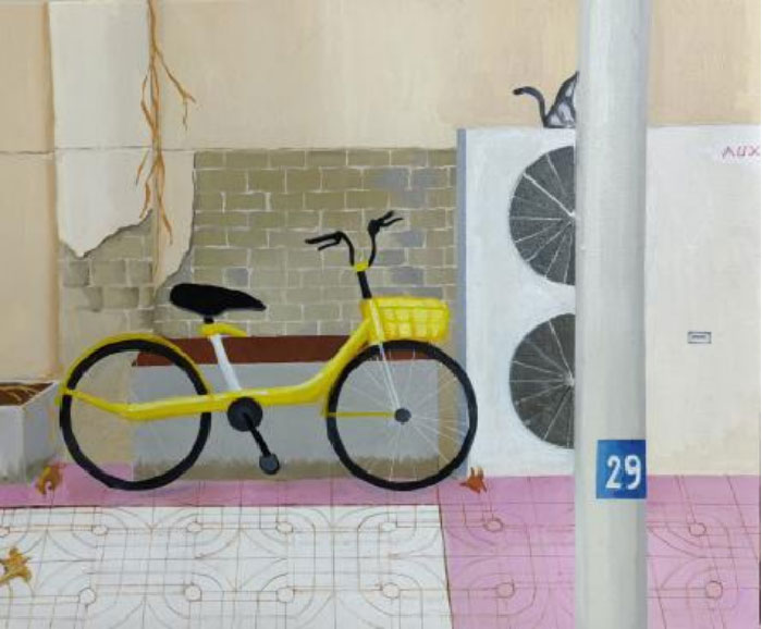 在《时光的褶皱》系列作品中,王蔚卿以西安市旧小区的楼道、街角,乡村老屋、庭院与仓库为描绘对象,捕捉那些被时光浸染的旧事物。斑驳的墙面、弃置的自行车以及散落在角落的旧物件,这些看似平凡的细节在光影交错间呈现出静谧的诗意,每一道裂痕都诉说着岁月的故事并记录着生活的痕迹。艺术家运用厚涂技法强化墙面的沧桑感,以低饱和色调营造怀旧氛围。通过平视或俯视的几何构图,将这些平凡角落升华为具有纪念碑意义的画面。这不仅是对旧建筑与生活痕迹的艺术记录,更是对城市化进程中逐渐消逝的记忆载体的凝视。艺术家希望通过画笔留住它们的美学价值与精神重量,在快速变迁的时代中唤起人们对过往的温柔回望与思考。