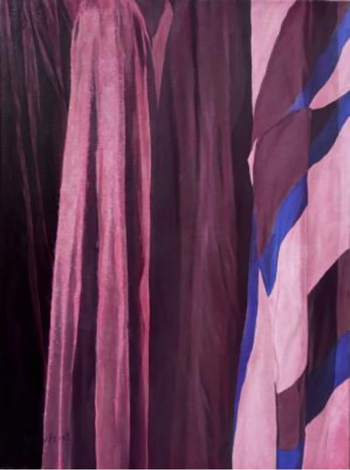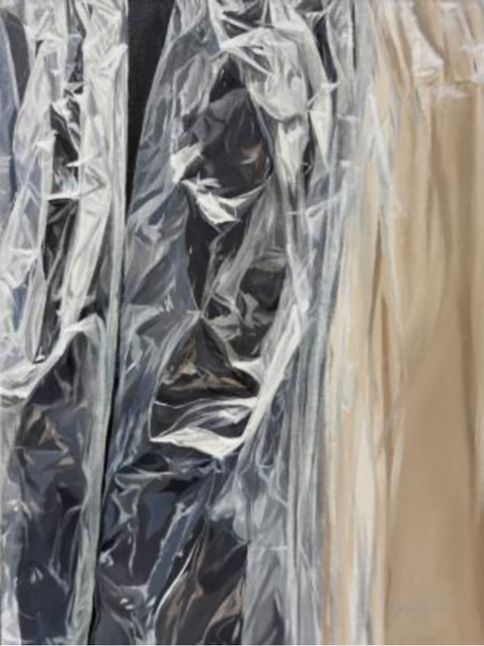 对俞意来说,衣橱便是一个世界,纵使挤得满满,还是会为下一件留下空间。整齐各色的衣裳缝隙散出淡淡的樟脑味儿,衣架和衣架之间,悬挂着无数个“我”,时间在此凝固,唤起一个个瞬间的记忆,如同博物馆中的标本,每一次打开它,便打开了昨天。而当玻璃纸沙沙作响、折射出微光,便意味着新的一天已然来临——阳光洒落温暖被褥,整装,再出发。衣物旧了,一道道褶痕像是成长的年轮,既封存往事,也孕育新梦。艺术家用写实的绘画方式,不厌其烦地描绘衣裳中的每一条褶皱和图案,这是对过去时光的回望。绵密叠加的笔触下有每一天的温度,创作过程会使人忘却一切的烦恼,沉浸在自己的世界中。