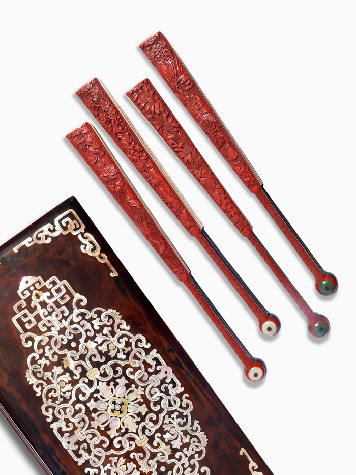 清乾隆 剔红会昌九老图、云龙纹、九秋图、荔枝纹扇骨一套四把