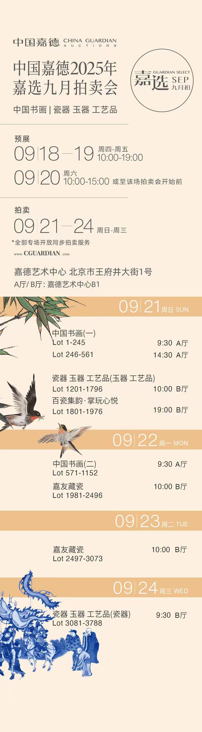 中国嘉德“嘉选”九月拍卖会即将开启——5大专场,3700余件藏品整装待发。9月18日-20日预展及9月21日-24日拍卖将于嘉德艺术中心如期而至。