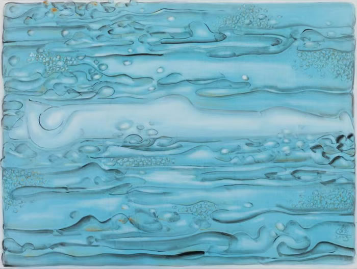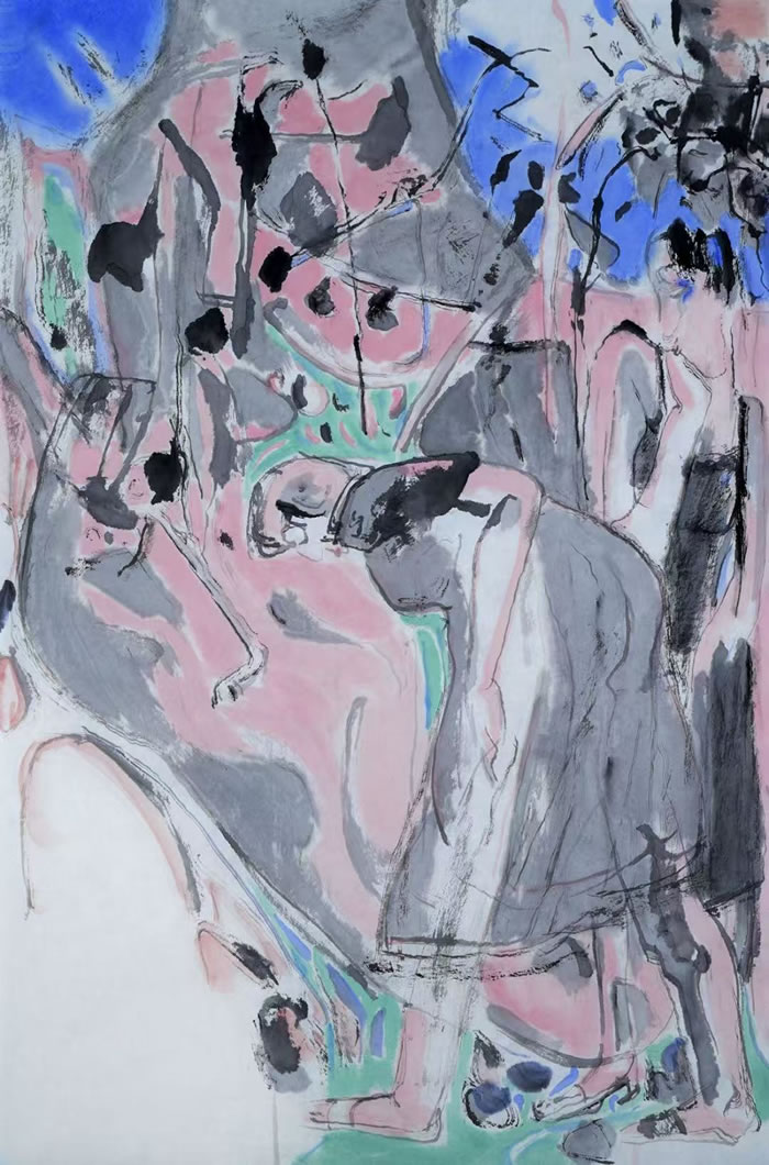 这些敞开怀抱拥抱世界的女性形体,既充满了野蛮生长的感性活泼,又充分沉浸于莲池的花瓣荡漾,不就是“凌波微步”的当代表达?不就是水融天下的艺术真谛?莲花已非莲花,人性已非人性,经过艺术家很多年对于形体分解与融合的实验,其带入色彩的变形记有着一个中国艺术家独特的万物拟似的感通。而现在,在绘画上,一切都融入水,人步入水中,沉浸期间,花如人,人如花,但花与人都如水,一滴滴水珠,进入微光之波的无尽振荡。在画家独特色彩与质感处理后,在具有明显中国色调与中国玉质感的技艺转化后,都宛若珠玉,透明晶莹,又彼此透映,宛若佛境。