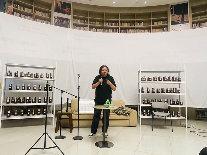 学术主持朱其说:老贺从自身特殊体验上升到人生的普遍困境。佛教的感悟、艺术语言、观念、装置的形式都很到位。诗人老贺一出手就是高位,天花板,把几种艺术形式连起来,很厉害。