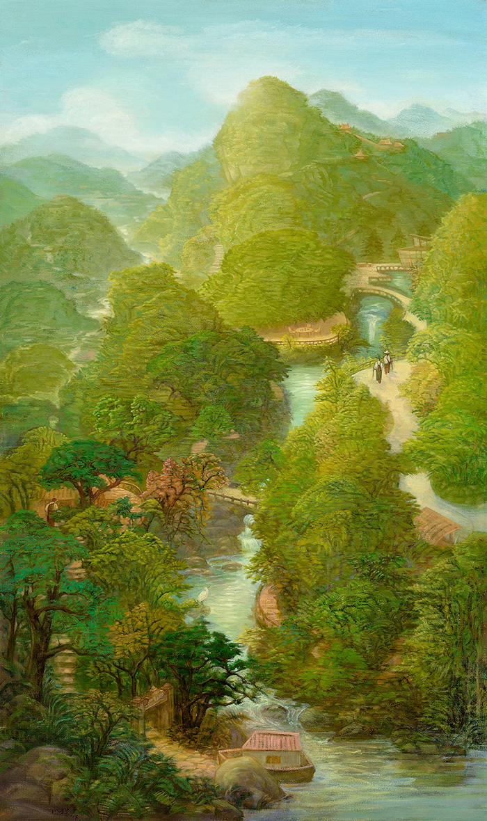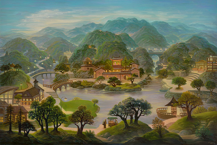 艺术家成梁善于运用油彩与水墨,将中国古典立轴山水与个人记忆融合,将描绘自然与城市共融的景致,以柔和淡雅的色调、轻薄通透的层染技法、诗意律动的笔触,构建出超越视觉语言的“心栖风景”。他以化约主义的创作哲学——从自然万象的纷繁复杂中,提炼出纯粹而有力的视觉元素,通过大色块的运用和极简的构图,直指物象的本质。这种艺术语言让观者能够拨开现实的迷雾,直抵生命的本真状态。