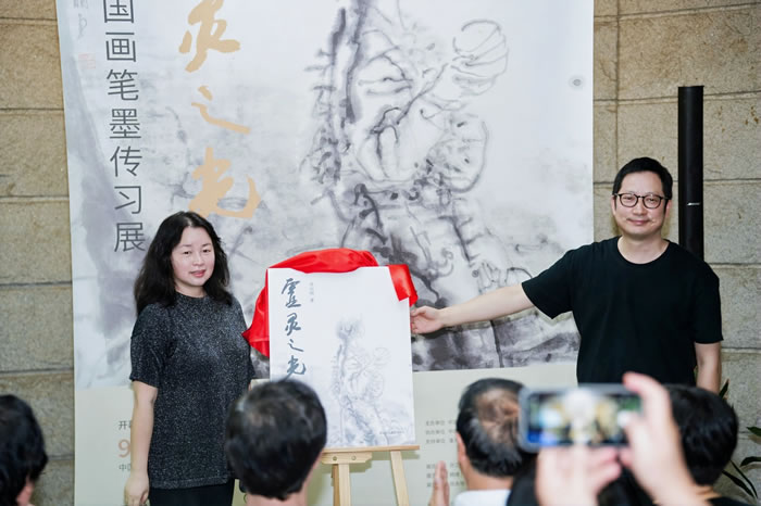 吴山明先生女儿,浙江大学当代水墨艺术家、策展人吴高岚与浙江人民美术出版社社长管慧勇为新书《虚灵之光——中国画笔墨语言和审美的拓展》揭幕