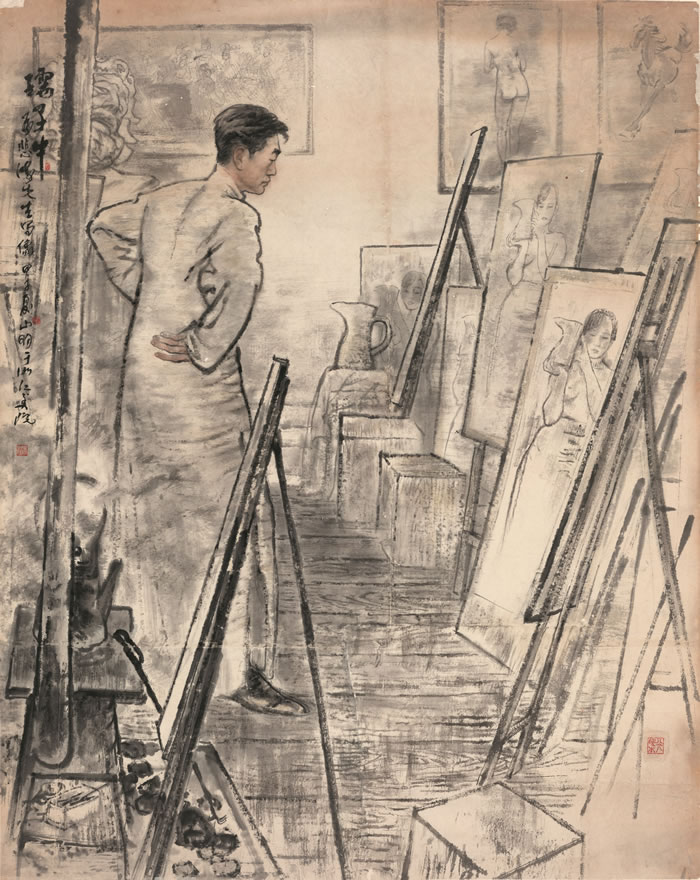展览里还有一批吴山明先生学生时代的素描、连环画、水墨人物作品,展现了他绘画的基本功和天赋。也有他绘制的黄宾虹、吴茀之等先师画像,及其收藏的李震坚、方增先等先生的作品。吴山明早年受教于潘天寿、吴茀之、李震坚等老先生,深谙“浙派人物画”风貌,然而他并未止步于流派成法,转而构建出婉约灵动的意笔人物系列和虚灵冲和的宿墨人物画体系。他的艺术探索,既反映出对老先生教学理念的深刻理解,也展现出在新时期文化语境下对中国画前途命运的独立思考。吴山明先生的笔墨传习,与其说是在风格上受到潘天寿等老先生的影响,不如说是笔墨理念和笔墨精神上的基因传承。