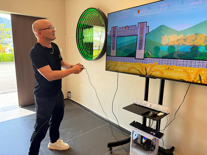 在米香中心的右前方有一座白色的三层小楼,这就是米香美术馆,展厅一层有两款以蕉岭风物元素创作的有趣作品。《蕉岭 SuperJolele》是01小组(陈荣彬,梁链喜)开发的一款在地化游戏,它以80年代街机的复古形式与围屋的砖纹、古树的年轮、稻田的脉络与蕉岭风土深度融合,通过“跳跃-探索-积分”的互动逻辑,重构地方记忆的叙事方式。让游客在游戏参与中,在趣味互动中体验蕉岭的历史与地方知识。