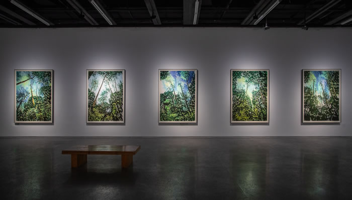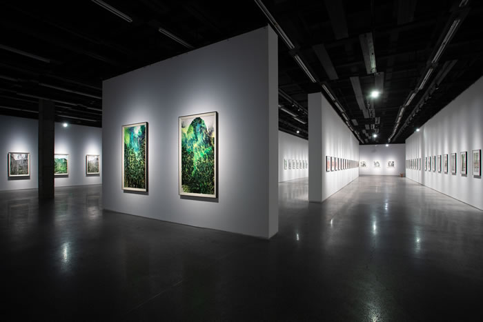 “念山”板块,展出系列油画作品近180幅:《江水泱泱》将逝者如斯的咏叹被转化为生命汹涌的宣言;在《云山苍苍》中,可见凝固的雷声、大地凸起的筋骨;《龙泉苍松》尽显坚劲,《大树参天》吐纳雄浑;《十里银杏》璀璨如金,《神仙山居图》超然物外;最终,《谿山新旅图》带领观者完成一场贯穿古今的精神行旅。