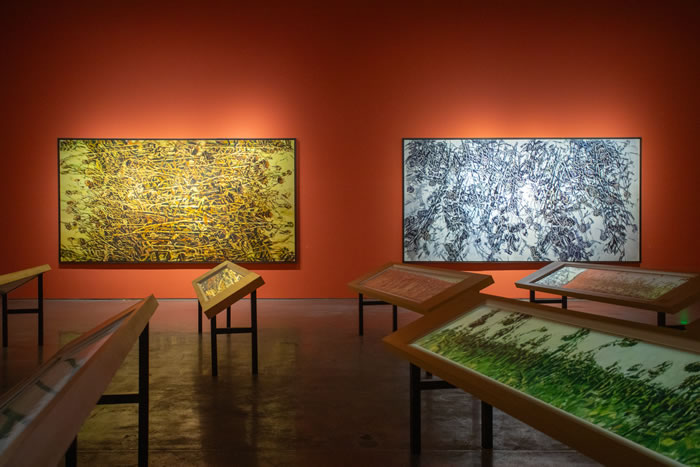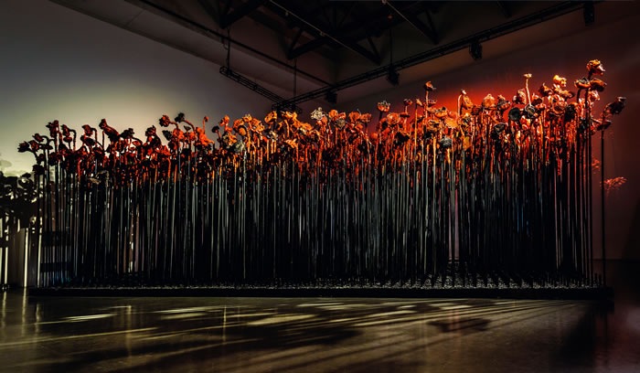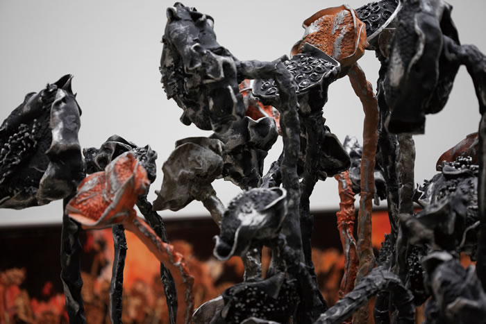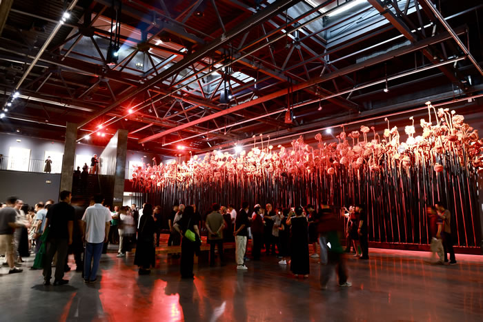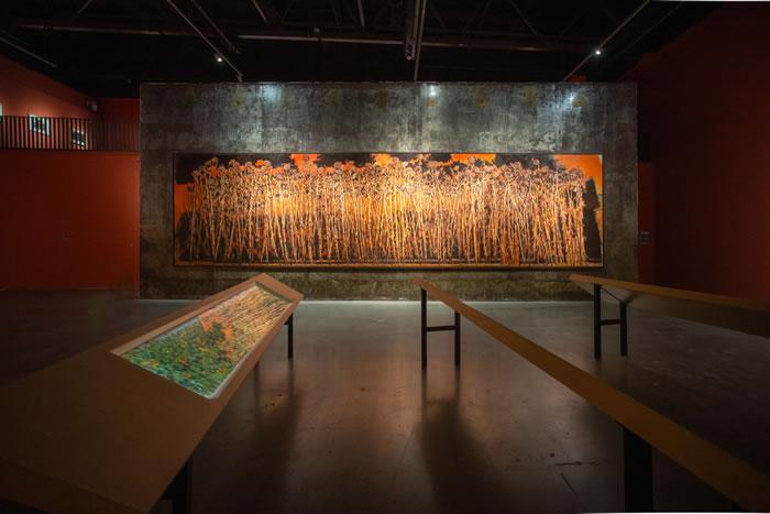 莲生水泽,葵立旱地,共生会否可能?许江与团队制作了上千个葵头与莲蓬头,以铜、铝为质,打磨如烛,熠熠生辉。这一枝枝葵头是烛火,是在荒原里读过的书。这葵又与莲比肩并立,生长在沙土与水泽中的垂直的生物能否共生?火与书会否因燃烧而共生?这片火的荒原,曾生长于国博的序厅、德累斯顿重建的博物馆、莱茵与莫梭尔交汇的德意志角、黄浦江畔艺术宫的穹顶。而今,它抵达三江汇流的甬城——火焰不息,缓缓升腾,以炽红点亮山河故土。