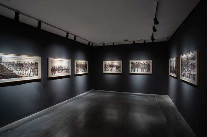 “共生”展厅内,三屏影像并置,交织成一道视觉史诗——铜锤击打葵盘,星火飞溅如雨;万葵逐日,又在秋风中垂首如鎏金。许江立于葵原,画笔与葵叶同颤,在巨幅画布上挥写万千葵姿。影像与雕塑群像共同构建了一个多重感知的现场:葵原的枯荣轮回、金属的千锤百炼、艺术家的孤身行野,共生不再是生物学意义上的并存,而是升华为一种跨越物种、时空与媒介的生命哲学,共同诠释着“共生”的深层内核:那是毁灭与新生的对话,是个体与时代的共鸣,亦是人文之山巍然矗立的精神见证,更是大地与命运间永恒的相互滋养。
