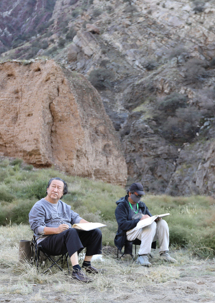 70余岁的中央美院教授崔晓东被贺兰山的壮美震撼,他用最质朴的笔触表达最深切感受,面对大山,一坐就是数小时。他说,在贺兰山的怀抱中,可以感受到一股的强大力量与无穷魅力。