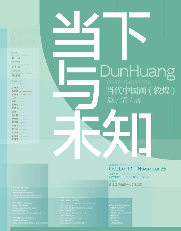 2025年10月10日,由中央美术学院、中国画学院和甘肃画院作为学术支持,艺术粮仓创始人张涛策划,中央美术学院教授刘礼宾担任学术主持的《当下与未知》当代中国画(敦煌)邀请展在敦煌国际会展中心启幕。此次展览特别邀请十六位在当代中国画具有代表性的艺术家,携近百余幅作品进行展出。