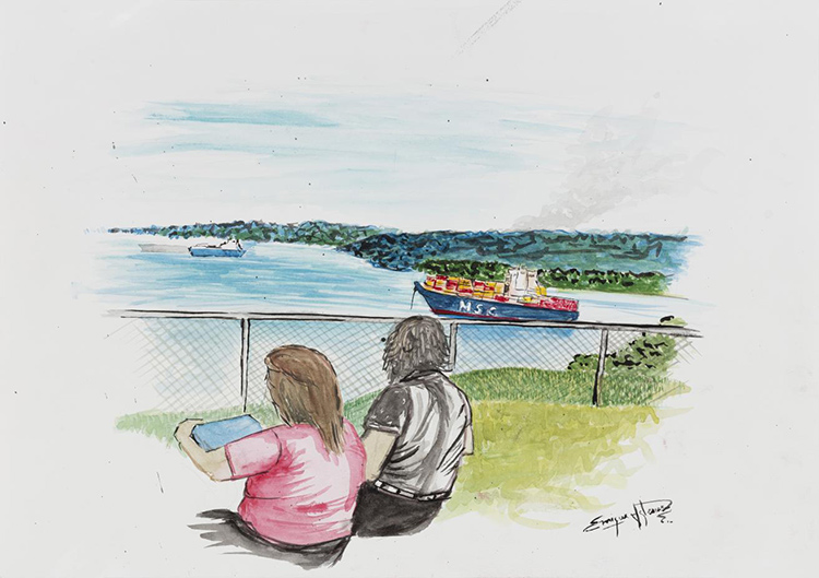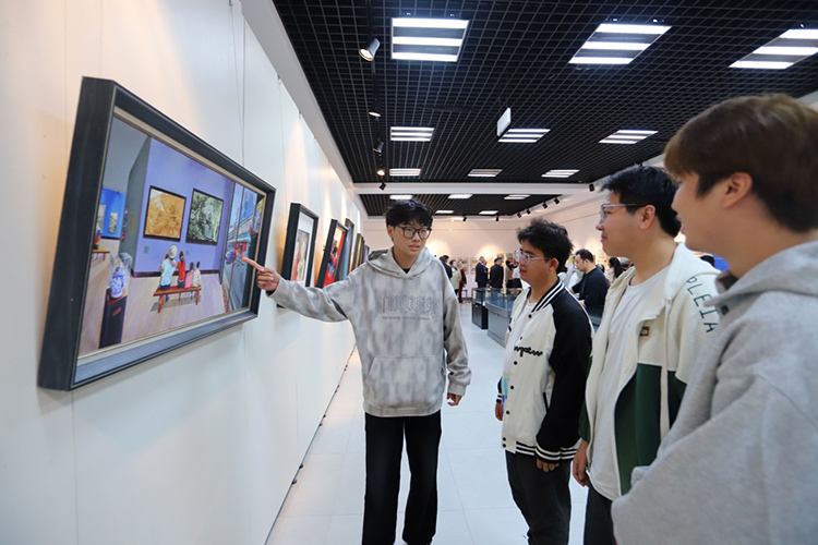 展览现场,创作者为现场观众耐心细致地讲解画作背后的故事。参观者悉心聆听,不时拿出手机记录画作细节,遇到感兴趣的内容还会主动与创作者交流——有观众好奇巴拿马运河画作中船闸的运作原理,创作者便结合当地地理特征与航运历史细细解答;也有观众分享自己游览扬州古运河的经历,与创作者探讨运河景观在不同文化语境下的艺术表达,展厅内满是跨文化交流的热烈氛围。