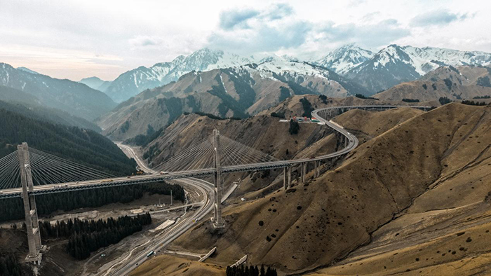 14日,写生团一行穿越“新疆第一桥”果子沟大桥。大桥横跨峡谷,与远山雪峰、层峦叠翠相映成趣,构成一幅气势恢宏的画卷。老圃深有感触地说:“越过山脊进入伊犁,满目葱翠扑面而来。特别是那片天蓝色建筑群,宛若将整个村庄浸润在湛蓝海水之中,如此独特的视觉体验,促使我必须探索新的艺术表现手法。"