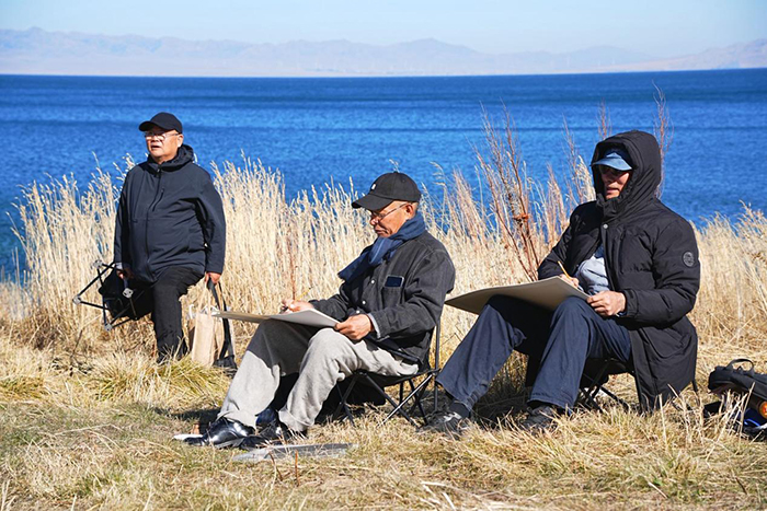 11日,写生团奔赴赛里木湖,湛蓝的湖水在阳光下呈现出层次丰富的蓝色,艺术家们顶着秋风支起画架,试图捕捉这片“大西洋最后一滴眼泪”的静谧与浩瀚。殷会利感慨:“新疆多元的文化资源始终滋养着艺术家的灵感,这次采风必将催生优秀作品。”