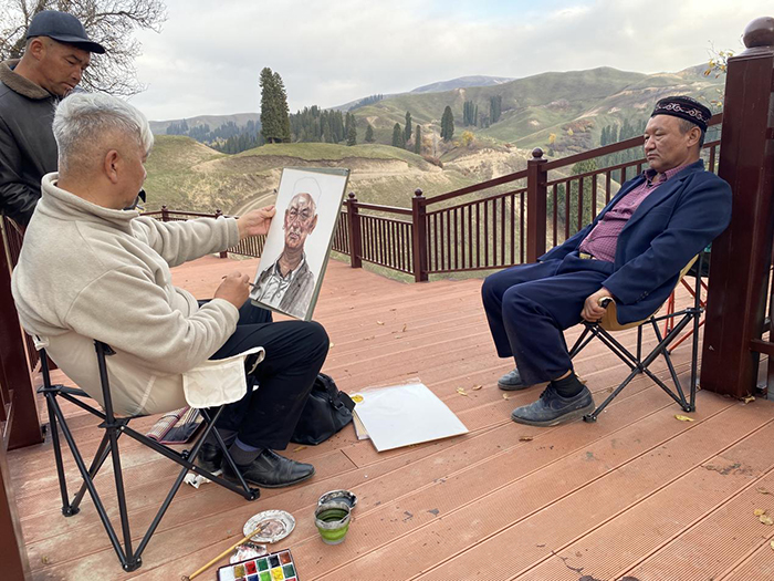 10日,艺术家们参观博尔塔拉蒙古自治州博物馆,草原石人、鹿石等文物静静诉说着游牧民族的历史。下午,阿里翁白新村的田园风光让写生团流连忘返,金色的杨树、葡萄架和农家小院,成为画笔下祥和的画卷。刘建表示:“此次写生行动计划周详,作为山水画家,我将用画笔表现新疆独特的自然与人文。”