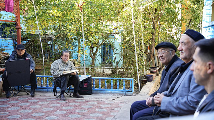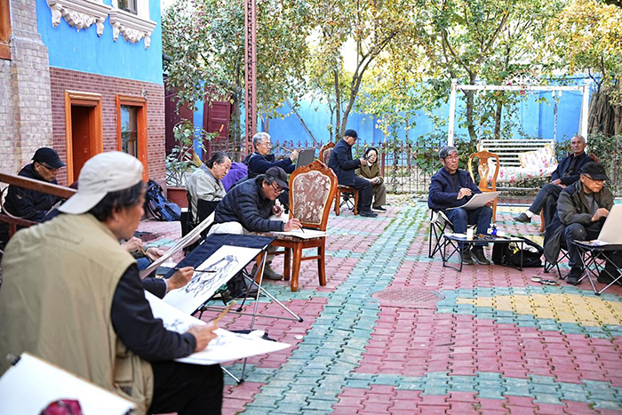 15日至16日的行程聚焦于伊宁老城的深度文化体验。首日,艺术家们走进六星街,其独特的放射状街巷格局与色彩明快的民俗建筑,为写生创作提供了丰富的视觉素材。次日,采风团来到喀赞其历史文化街区,搭乘当地特色的“哈迪克”马车穿梭于纵横交错的街巷。他们应邀走进维吾尔族传统民居,在雕花精美的廊檐下与主人品茶交谈,了解世代传承的居住智慧与生活习俗。随后的民俗活动中,一场融合了维吾尔族、哈萨克族、塔塔尔族的歌舞表演精彩上演。艺术家们被表演者精湛的舞技与饱满的热情所感染,纷纷打开速写本,用流畅的线条记录下这流动的艺术瞬间。许俊表示:“伊犁的多民族文化传统令人印象深刻,画家应用画笔描绘山河与群众,真正融入时代生活。”马海方补充道:“当地人的朴实与融洽互动,让写生更接地气。”