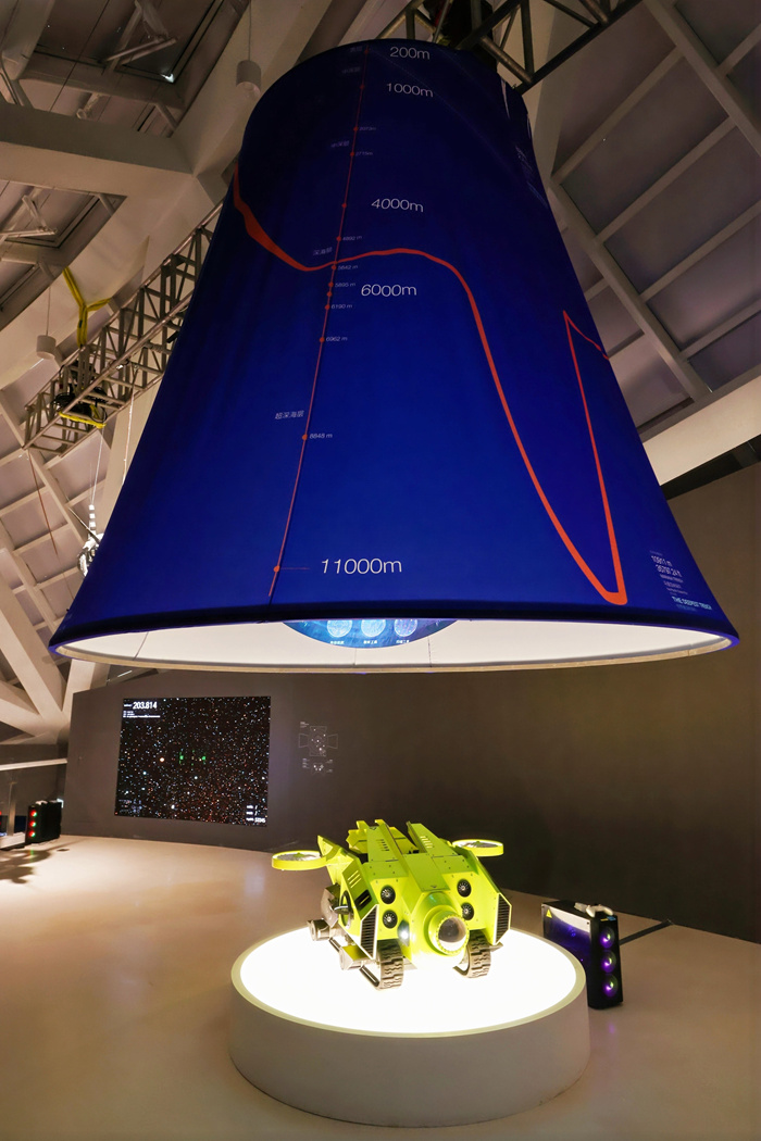 由中国美术学院创新设计学院计算艺术研究所与中国科学院创作的虚拟仿真交互装置《深海智能无人潜航器》是一种集机动性、多功能与广阔机动范围于一体的深海科学考察智能装备能为深海科考提供坚实支撑。展览中呈现的是基于深海自主机器人工作平台设计的多功能工作平台概念方案,生动展现未来深海科考工作场景,向观众充分展现深海科学的独特魅力。由西湖大学自主研发的新一代深海潜水器《西谷I号深海仿生鱼型潜水器模型》,以“水下具生智能”为核心架构,依托仿生学理论突破与前沿人工智能技术,凭借高机动性、高稳定性、高灵活性以及高静谧性,成为深海探索领域的一项革命性创新。