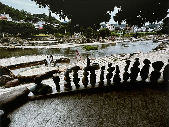 从2021 年开始,艺术家陈文令自筹资金,带领团队在家乡福建泉州安溪县金谷打造了大型艺术乡村振兴项目——金谷溪岸艺术公园。这一项目充分结合了自然与文化条件:艺术家以闽南“石跳钉”为灵感,取法中国古代园林“叠山造园”理念,因地制宜,就地取材,依托金谷溪河道、闲置民宅、荔枝林及荒地等,将自然景观与当代艺术相结合,建设了雕塑艺术长廊、亲水工程、溪岸步道、露天茶室、艺术景观等项目,同时有效保留了古河岸的自然环境和历史遗存。