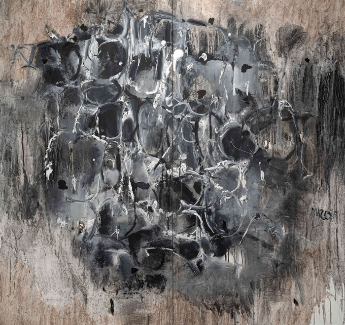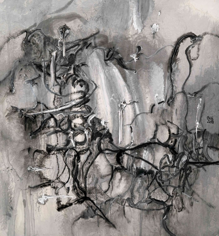 徐善循将自己的抽象绘画命名为“鸿蒙系列”,该系列开始于2023年。经过十多年的锤炼,这类创作已臻成熟。“草木灰线”是徐善循发明的用于创作抽象绘画的材料和形式,通过这种独特的材料和形式,他创造了一种新颖别致的抽象绘画风格。黑白线条依然是这类抽象绘画造型的骨干,而作为画面的背景或基底,徐善循采用了包括水墨晕染、油彩厚涂和丙烯滴洒在内的各种手法,营造出一种宇宙苍茫、鸿蒙未开的超现实意境。
