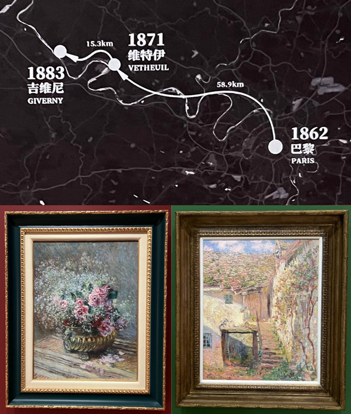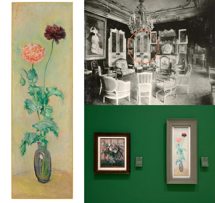 左:克劳德・莫奈,《双花门》,1883年;右上:保罗·杜朗-鲁埃尔公寓客厅;右下:展览现场的《双花门》