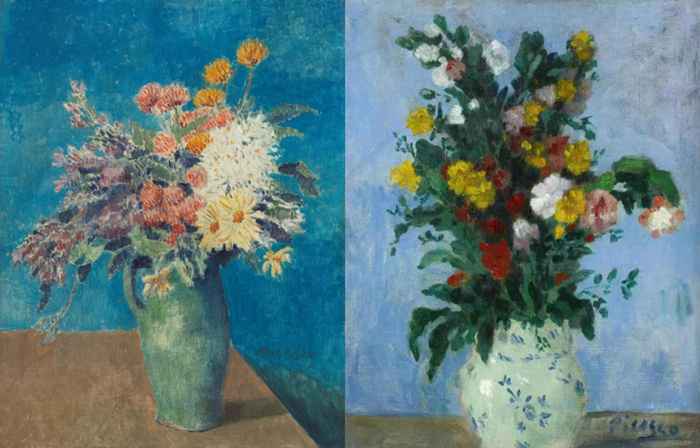 巴勃罗·毕加索(1881-1973,西班牙),《瓶花》,左:1904年;右:1901年