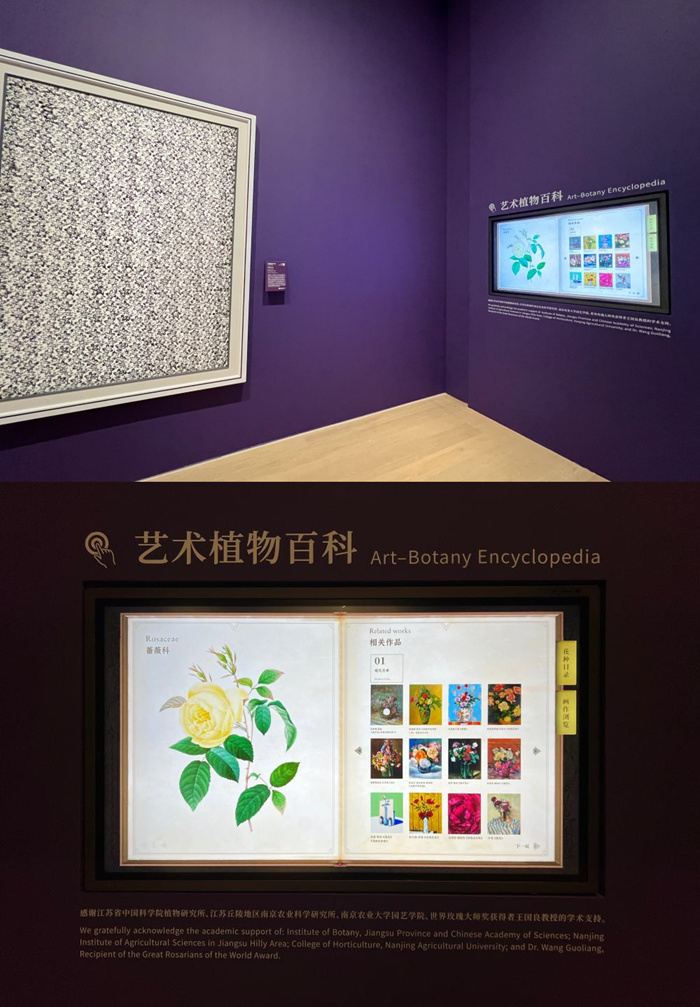 以上部分仅能呈现展览作品小小小小的一部分精彩内容,而在“动静无尽:馆藏花卉主题艺术杰作”展览现场,拉好感的观展体验绝不止“故事链”式空间叙事以及对于女性艺术家的关注。位于第三章节角落、自主开发的“艺术植物百科”互动屏也是大大的加分项,解析全场艺术作品所涉花卉种属等植物学关联知识的互动查询系统,将研究成果进一步转化成为每一名观众可触可感的知识养分。