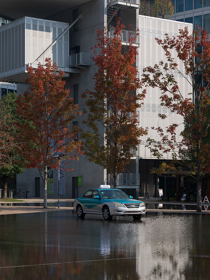 《自然是一辆出租车》试图表达,人类使用自然,正如使用出租车:招手即停,按需付费,下车即忘。自然被简化为一种可计量的、工具性的服务。在场馆之外,水镜广场也被纳入展陈空间,一辆杭州本地出租车停泊其中,抽象的生态危机就这样锚定在一个习以为常的具体物件上,迫使观众反思自身与自然环境那种功利性的、缺乏敬畏的关系。