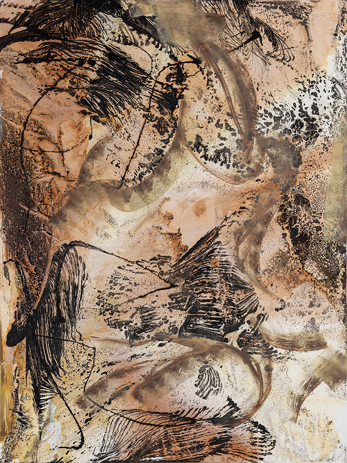 “在西北行走的十年,更多时候是在野外,或者和牧民在一起,感受那里强烈的风土和具体温热的人情味。最近五年,真正有了能安静闭门创作的时间和心境,早年在野外沉淀下的所有感受——那些风沙、温度、枯死的胡杨、迁变流转的沙丘戈壁、风声与静默,开始翻涌,让我有了创作的冲动。于是我开始系统地作画,从感受出发去探索形式。”赵东诚说。