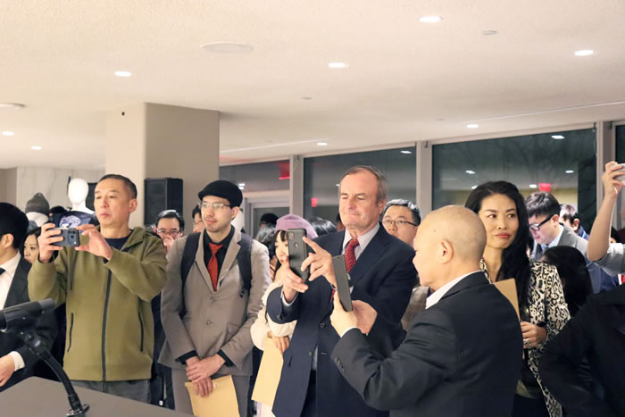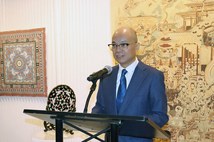 中国驻纽约总领事馆教育处教育参赞余有根在开幕式上致辞,对清华大学美术学院师生访问纽约表示欢迎,并对展览的开幕致以祝贺。他指出,敦煌作为丝绸之路上的历史文化重镇,其壁画、雕塑与典籍是人类共有的文化艺术瑰宝。余有根赞赏清华大学美术学院在敦煌艺术研究与创新实践中的努力,并期待各机构、研究者和爱好者进一步加强协作,共同推动敦煌文化的保护、研究与当代传播,让这一璀璨遗产在世界舞台上焕发新的时代光彩。