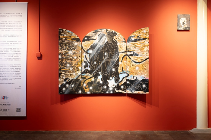 《阿特拉斯》《藤蔓会记得》《夜的采集者》《阴阳》,这些雕刻木板丙烯作品都呈现出非常独特的机理和语言。更让人印象深刻的是《梁祝》系列,阿苏库·阿凯以西方祭坛画的方式呈现了一个中国的传说。“祭坛画令我着迷的,是它垂直的结构、神圣的戏剧性,以及对光线的精妙安排。而在接触中国传说时,我被其叙事的力量所震撼——那些传说总能将奇幻、伦理、蜕变与命运完美交织。两相结合,便能呈现出一个让两种传统自由对话的空间,这也是我的艺术宣言。”