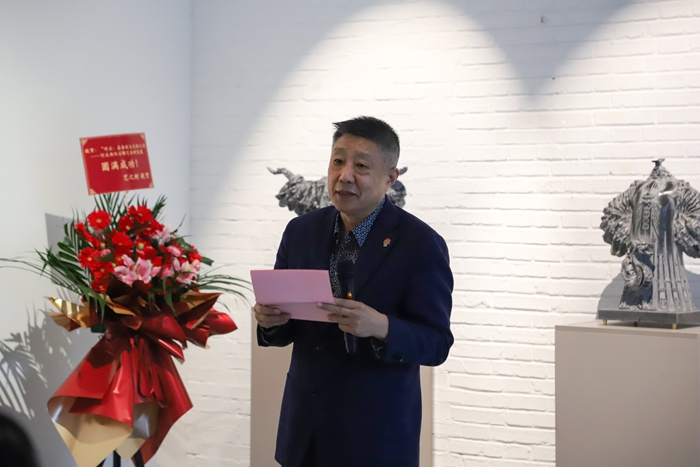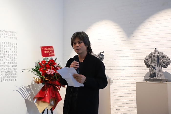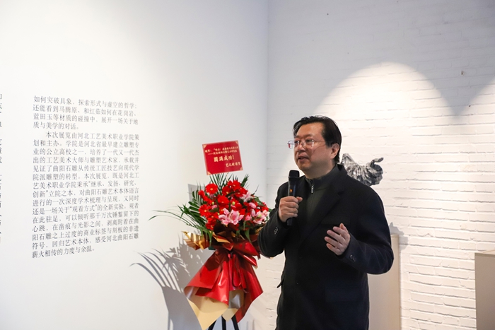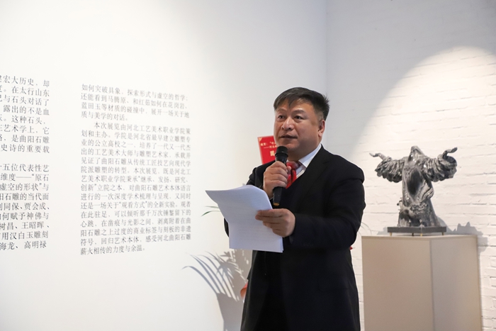 才大颖对展览成功举办表示祝贺,并表示,这不仅是回归艺术本体的深刻觉醒,更是“产教融合”与“学术引领”的成功实践,为行业转型升级提供了示范。王谞昭在致辞中谈道,此次展览不仅是技艺的展示,更是传统文化与当代审美的深度融合,希望能以此为契机,让更多人关注并重新认识曲阳石雕艺术。高英坡作为参展艺术家代表发言,他分享了在石雕创作中守正创新的体会,表达了对这份古老技艺的敬畏之心以及在当代语境下进行艺术探索的决心。张广军指出,本次展览旨在引导观众超越视觉,通过“听石”回归艺术本体,探寻曲阳石雕的当代精神内涵。他强调,学校将持续以产教融合推动传统技艺的现代转型,以学术赋能产业高质量发展。