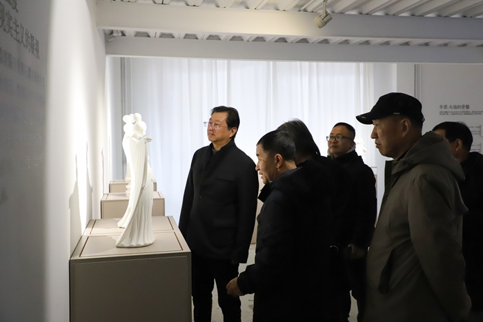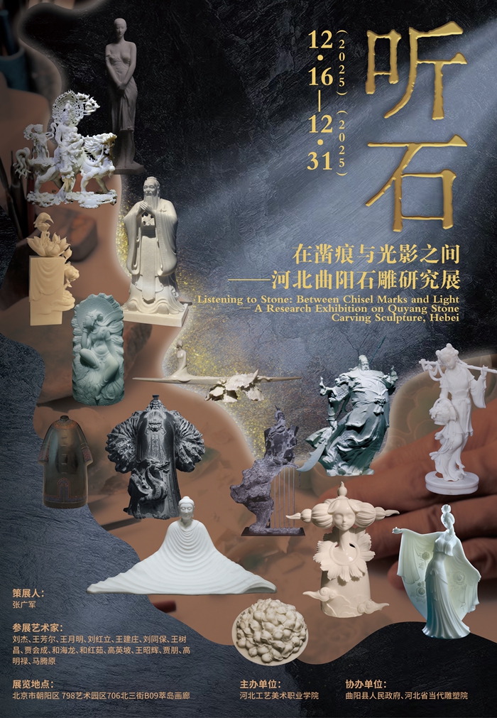 2025年12月16日,由河北工艺美术职业学院策划并主办、校长张广军担任策展人,曲阳县人民政府和河北省当代雕塑院协办的“听石:在凿痕与光影之间——河北曲阳石雕艺术研究展”在北京798艺术区萃岛画廊开幕。
