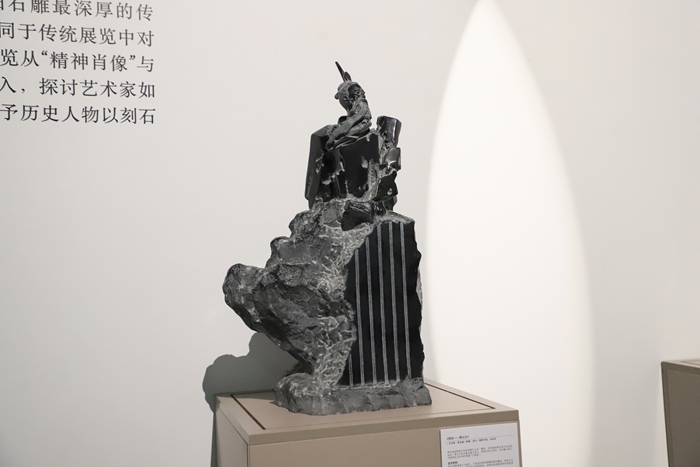 贾会成的《授业——黄石公》利用青石沉郁的哑光特性吸收光线,保留天然层理以模拟山岩质感,用大块面的简约结构强化了作品的纪念碑性,达到了“人石合一”的隐逸境界。