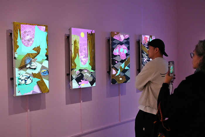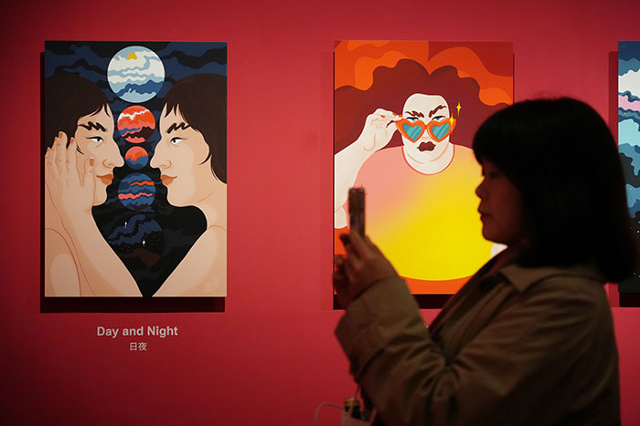 在“社会”单元中,艺术家关注日常经验中隐蔽的结构性压力与人际互动的细微情绪。如克鲁布·加洛普的《04:23》以黑白图像呈现失眠与社会压力的隐性机制;他的另一个作品《是什么让我们疲惫不堪》以蜡染技法在旧床单上印制抽象人形等方式,让“疲惫”具象化,温和地要求观众停下脚步,重新思考如何在生产和生活之间取得平衡。本单元作品以幽默与反讽勾勒现代生活的荒诞,揭示身份、都市体验与时代情绪的复杂性。