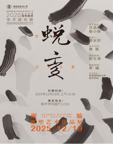 2025年12月19日上午,由景德镇陶瓷大学美术学院主办的景德镇陶瓷大学青年教师推介计划2025学术提名展“蜕变”—一谢璇雕塑艺术作品展在景德镇陶瓷大学美术学院展厅1/101正式开幕,展览展至2026年1月19日。