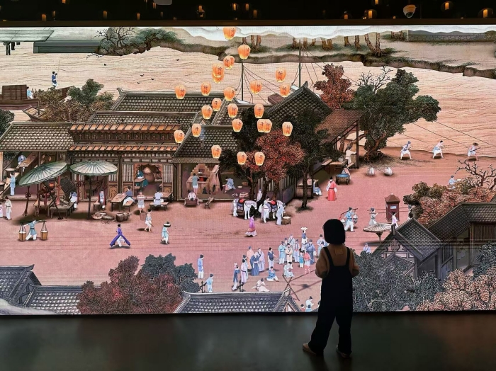在严谨的学术研究基础之上,德基艺术博物馆以馆藏《金陵图》为蓝本,以数字化的方式再现古代中国的城市图景和社会风貌。“金陵图数字艺术展”通过人工智能等前沿科技,以全球首创的“人物入画,实时跟随”互动观展模式,让观众可以通过智能手环“走进”画中,通过当代科技实现古今互动,穿越到千年前的宋代南京,切身感受文明的脉动。
