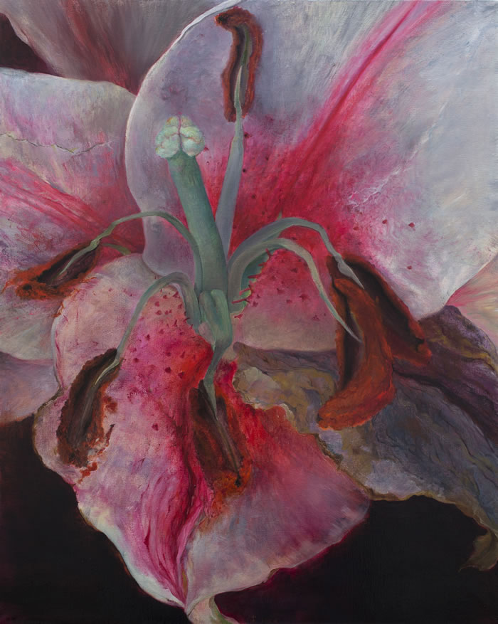 与此相伴的花卉系列作品,同样源于身体经验。她刻意将花画成有血有肉的形态,强调色彩的饱和与肉身感, 以回应手术中对肉体的直接接触。在谈及自画像时,陈卉将身体经验进一步延伸至精神层面。她认为,长期的创作实践本身即是一种对精神困境的回应。绘画之所以得以持续,是因为一种无法被压抑的表达冲动。在她看来,正是强烈的感知催生了行动, 感知与行动构成了创作的内在动力 。在此基础上,陈卉将讨论引向更为宏观的当代处境 。她指出, 在 AI 与技术高度介入日常生活的当下,人们正在逐渐丧失自身的感觉能力。感觉被屏幕与算法所代理,主体性随之变得弥散。个体的精神世界被不断外包给网络系统,在信息共享的同时,也伴随着彼此监视、操控与重塑。人在算法反馈的循环中逐渐失去主动性,呈现出一种被动 、沉默 、近似植物的状态。